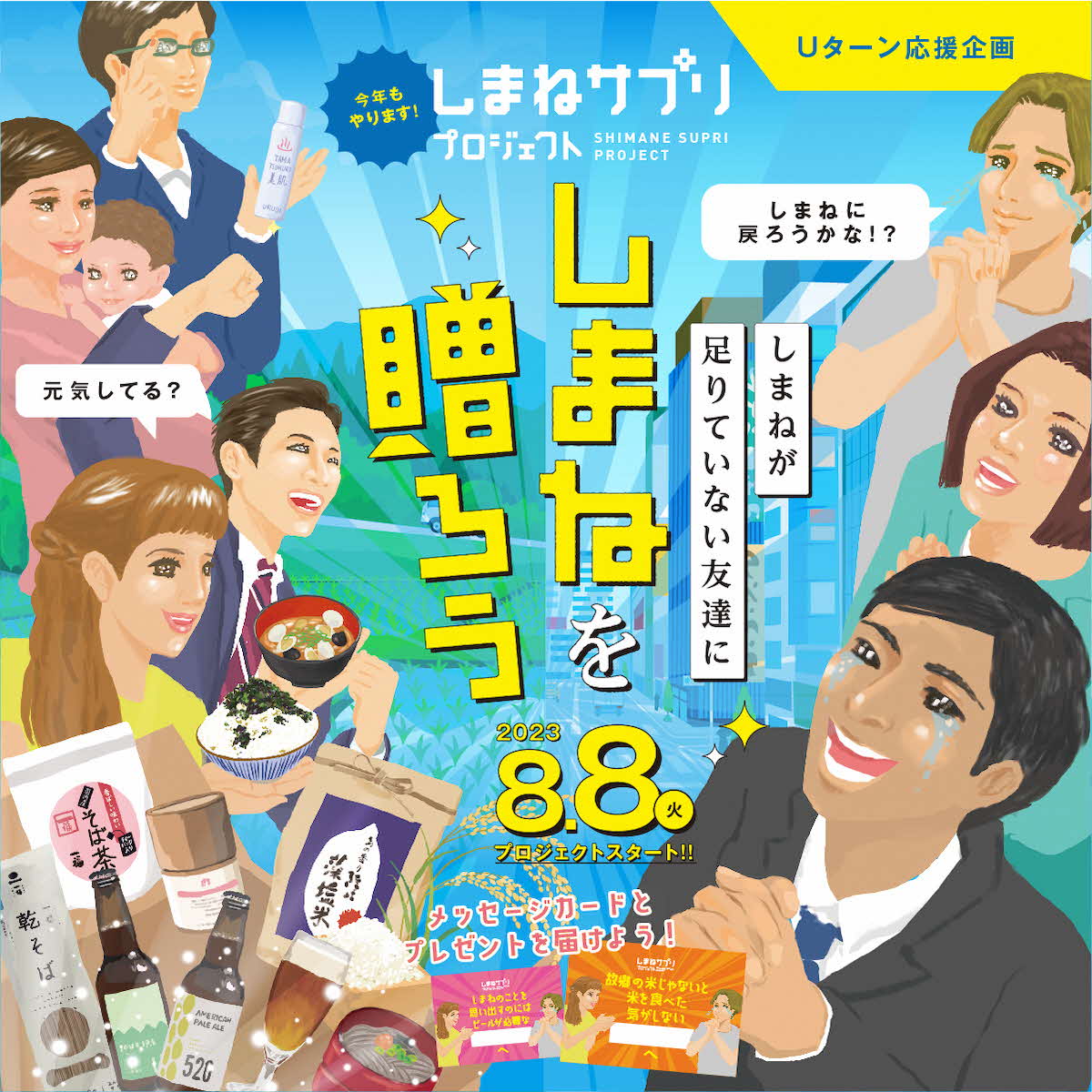 島根県内に住む若者から県外に住む友達へ、島根県ゆかりの特産品とメッセージを「しまねサプリBOX」として贈る。また、Uターンサポーターには、財団が実施する事業の情報発信に協力していただく。