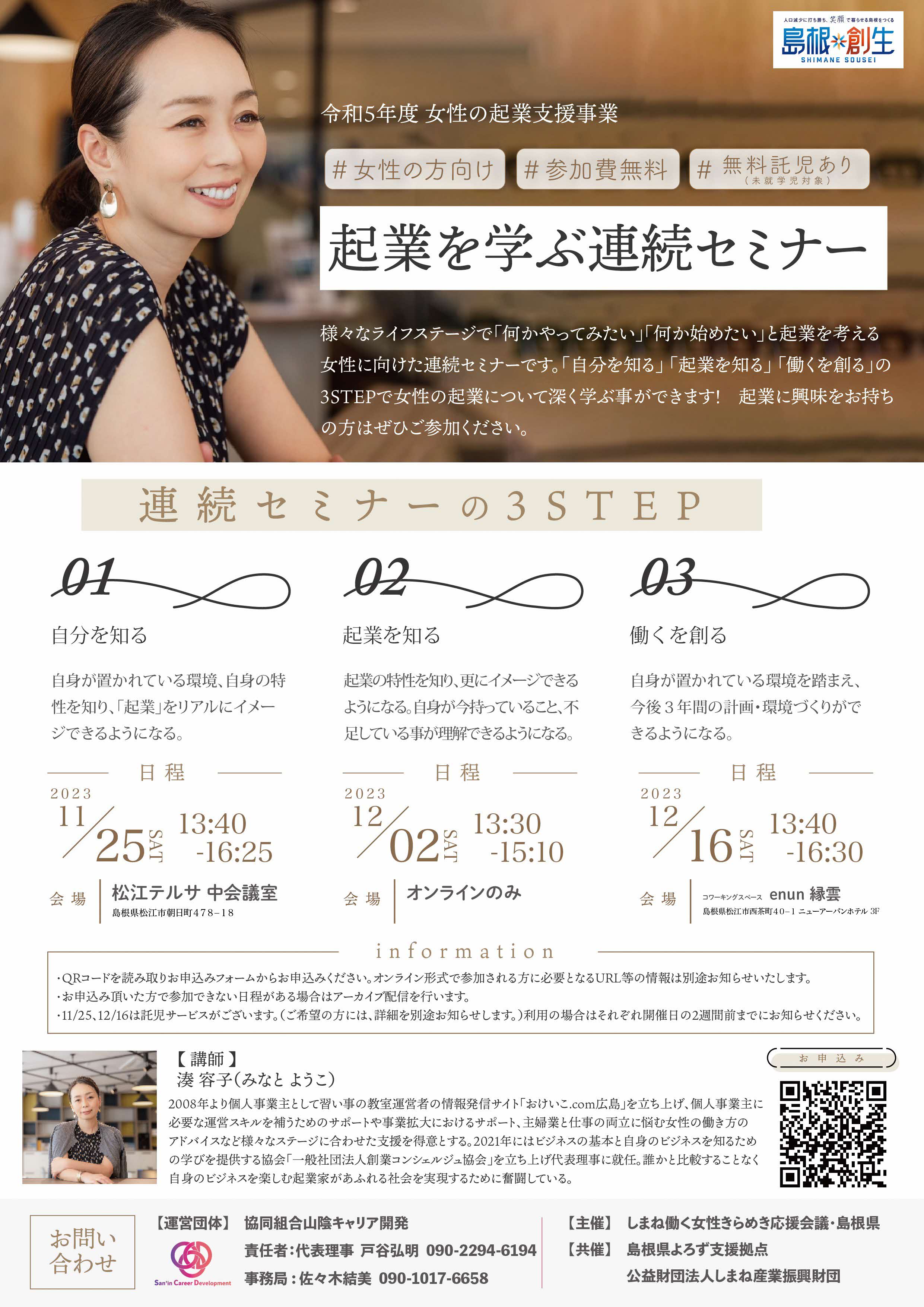 様々なライフステージで「何かやってみたい」「何か始めてみたい」と考えている女性に向けたセミナーです。「自分を知る」「起業を知る」「働くを創る」の3ステップで起業について深く学ぶ3回連続のセミナーを開催します。