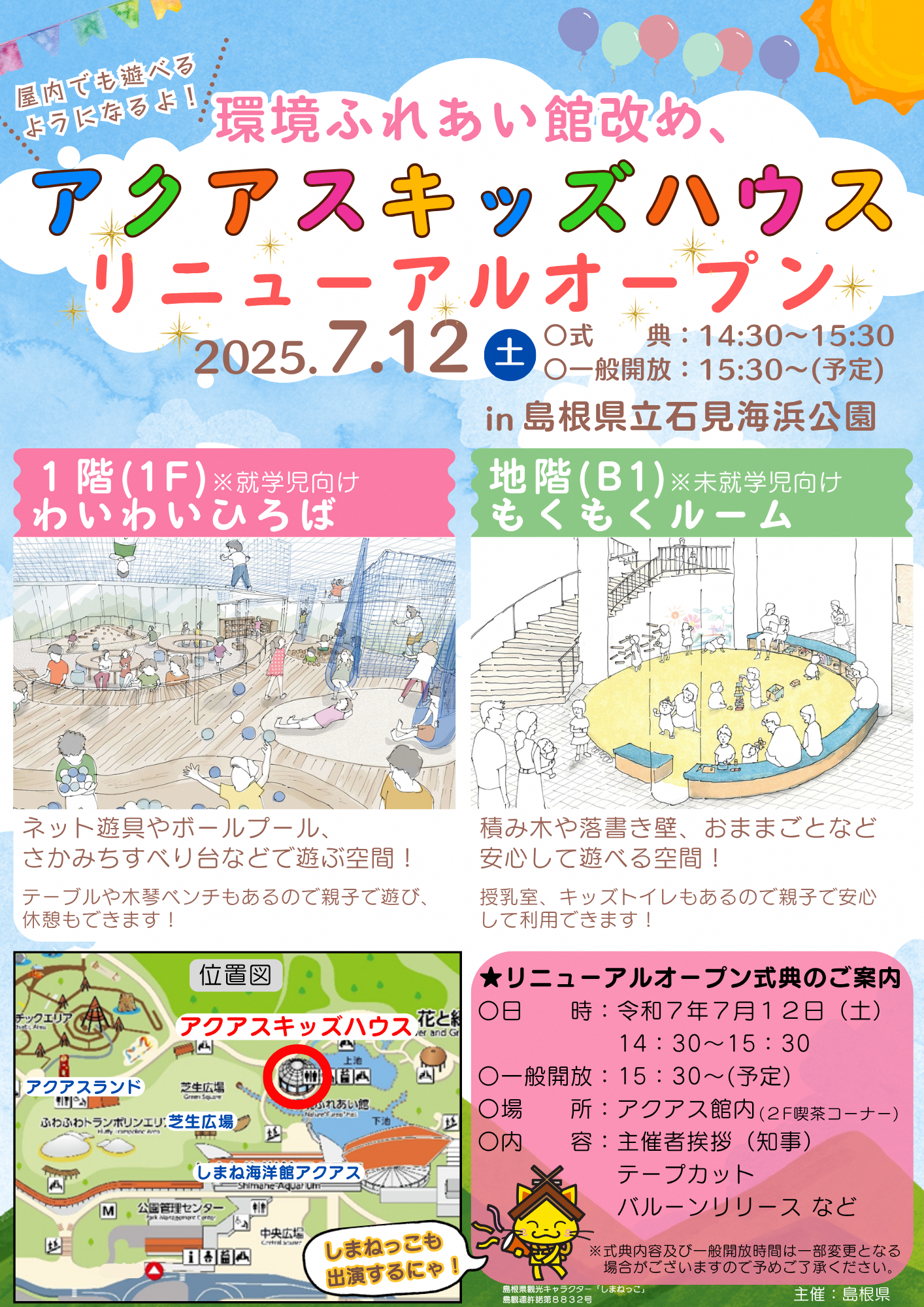 島根県立石見海浜公園 「環境ふれあい館」は、「アクアスキッズハウス」へ名称を改め、ファミリー層が安心して遊べる「屋内遊戯施設」にリニューアルオープンします。つきましては、下記のとおり式典を執り行いますので、お知らせします。
