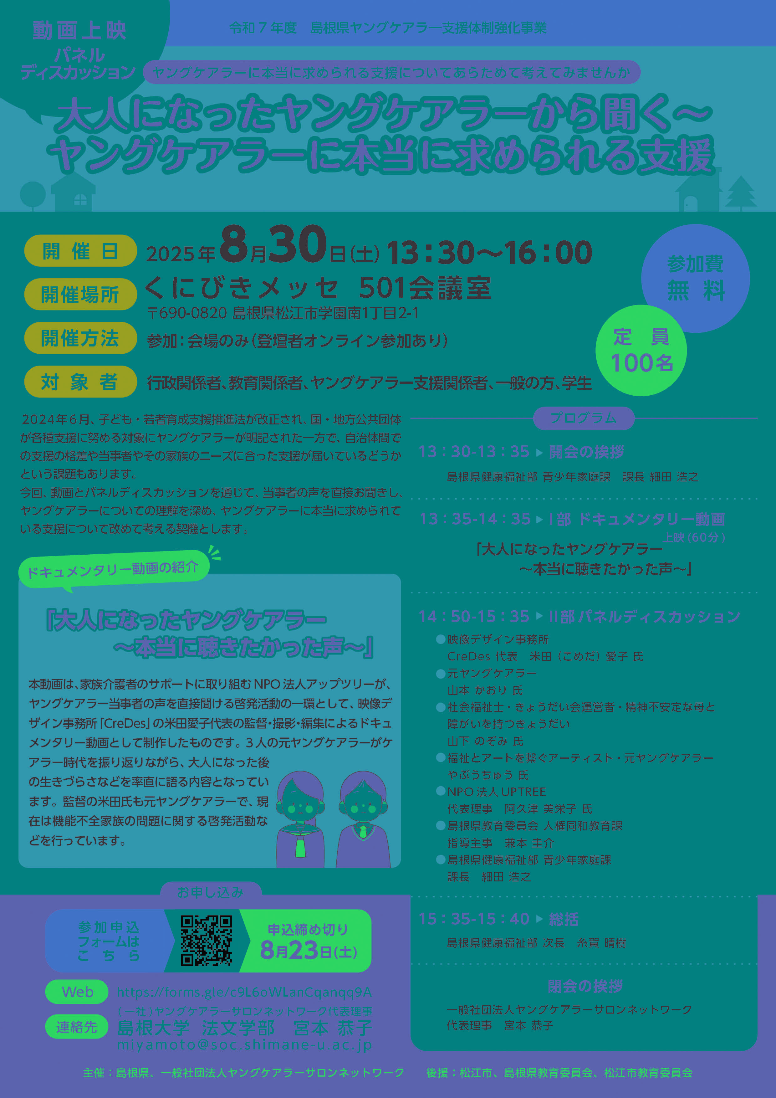 1634 「令和7年度島根県ヤングケアラー支援体制強化事業公開講座 ~大人になった ヤングケアラーから聞く~ ヤングケアラーに本当に求められる支援」の開催について