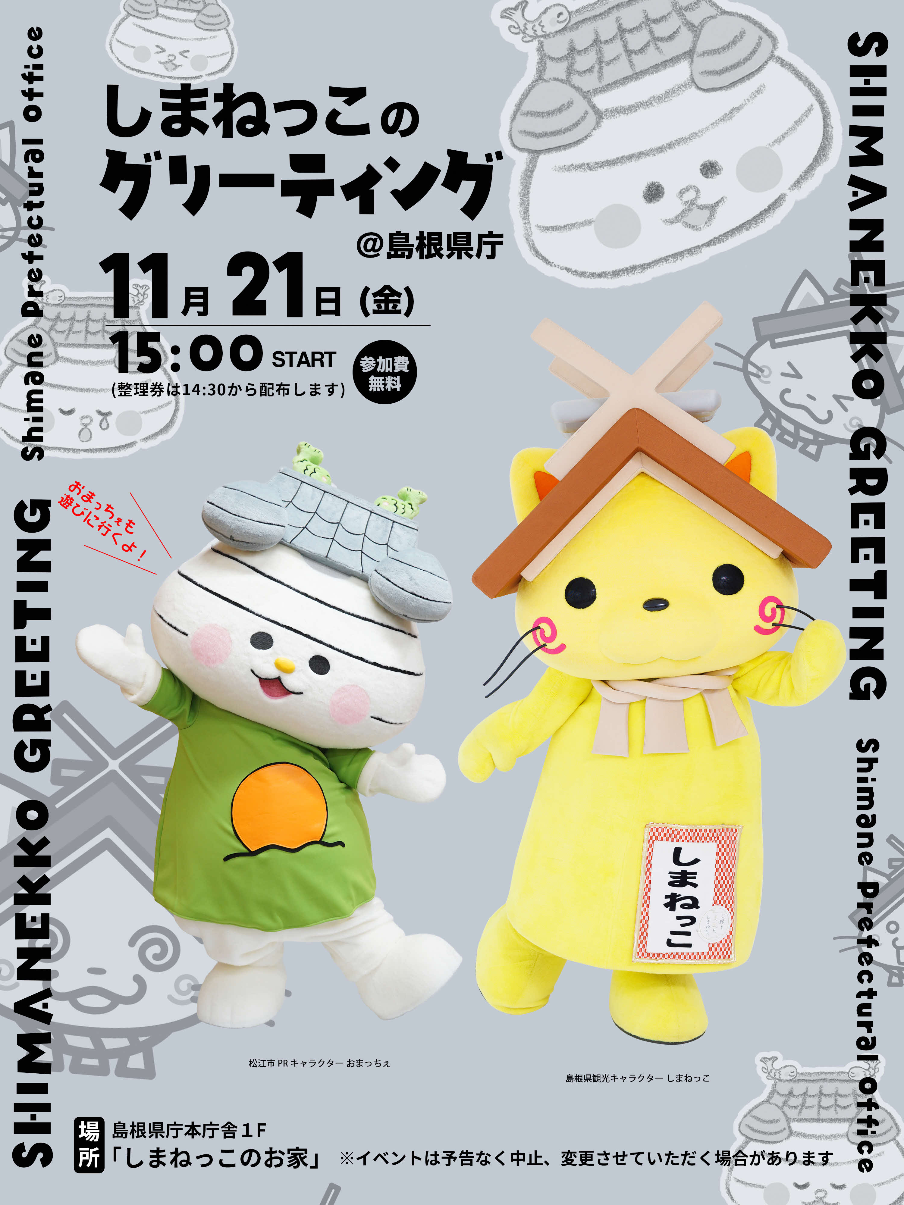 新松江市合併20周年と、松江城天守国宝10周年を記念して今年誕生した松江市PRキャラクター「おまっちぇ」が、しまねっこと一緒にグリーティングを行います。