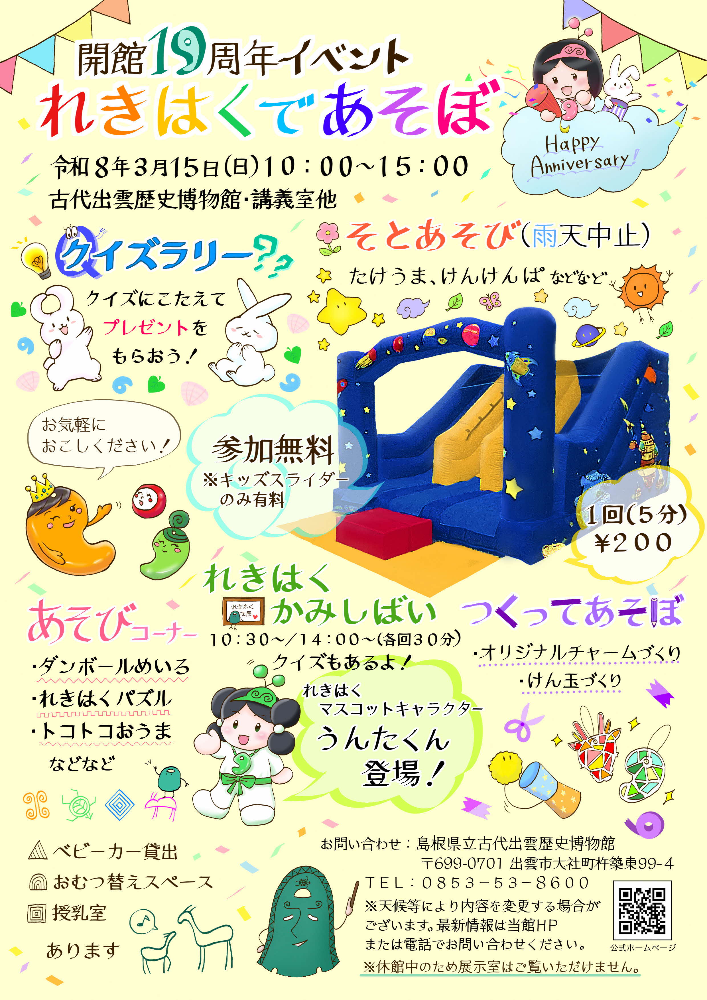 古代出雲歴史博物館は、令和8年3月10日(火)に開館19周年を迎えます。これを記念し、開館19周年記念イベント「れきはくであそぼ」を開催しますのでご案内します。
